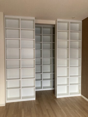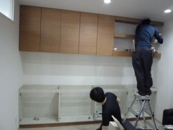 オーダーにて製作した壁面収納棚の各パーツ部分を設置していきます。