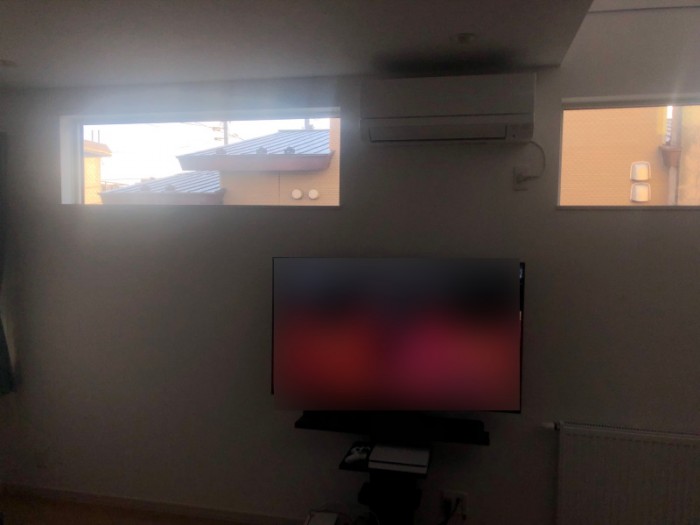 リフォーム前のリビングです。テレビ上の明かり取り窓2か所に、横型ブラインドを取付けします。